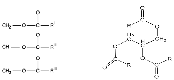 Fats are an essential part of obesity. Chemically, fats are a type of lipid consisting of triesters of glycerol and fatty acid tails known as triglycerides. They are mostly soluble in organic solvents and largely insoluble in water. Fats are solid at room temperature. The chemical structure of a triglyceride is shown below (Figure 1):