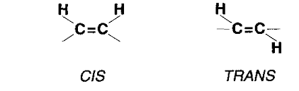 Unsaturated fatty acids are mainly of 2 types, cis and trans forms. They are geometric isomers. Cis fatty acids are most commonly found in nature and are healthier for human consumption while trans fats can have deleterious effects on human health such as increased risk for cardiovascular disease. Trans fats are rare in nature and are mostly formed by industrial hydrogenation of vegetable oils. They are normally solids at room temperature and increase the risk for clogging the arteries. Trans Fats are considered the worst type of dietary fats. Cis binding refers to the binding of 2 hydrogen atoms to the same side of a carbon double bond, while trans binding refers to the binding of 2 hydrogen atoms on opposite sides of the carbon double bond. The structural differences between cis and trans binding is shown below (Figure 2):