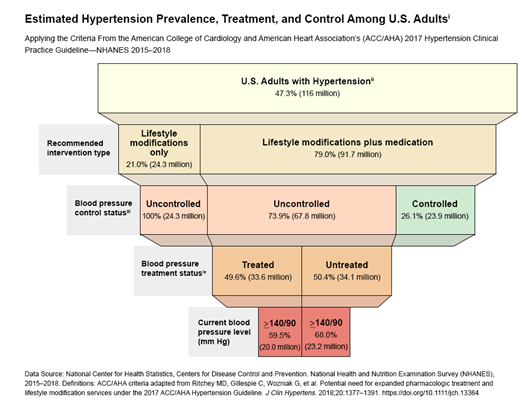 Figure 1 Summary of estimated hypertension prevalence, treatment and control among US Adults. From NCHS, Centers for Disease Control and Prevention, National Health and Nutrition Survey (NHANES), 2015-2018.