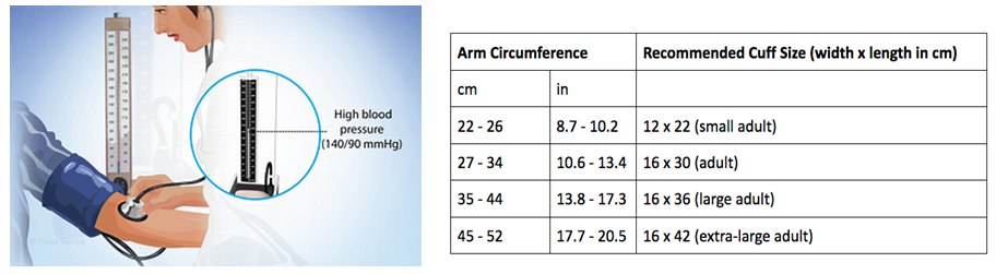 6BP guidelines. https://targetbp.org/wp-content/uploads/2017/11/Measuring_Blood_Pressure_In-Office-pdf.jpg and https://support.omadahealth.com/hc/article_attachments/360035978753/Cuff_circumference_chart.png