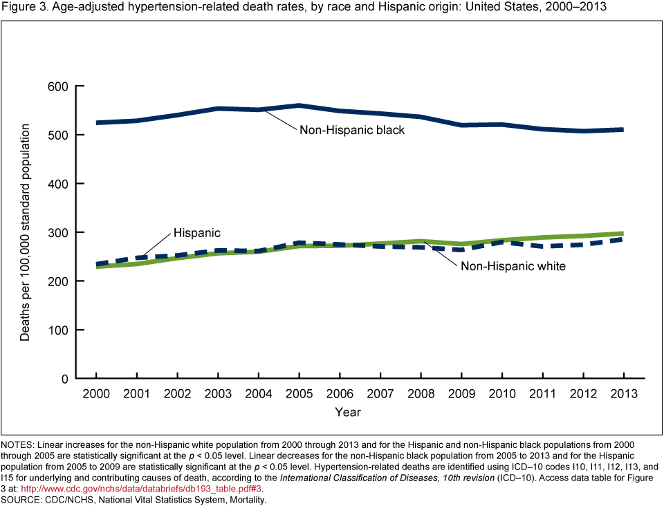 In 2014, age-adjusted hypertension-attributable mortality rates per 1 000 persons for non-Hispanic white, non-Hispanic black, and Hispanic-American men and women were 19.3 and 15.8, 50.1 and 35.6, and 19.1 and 14.6, respectively an as reported in 2015-2016 depicted in Figure 9 below: