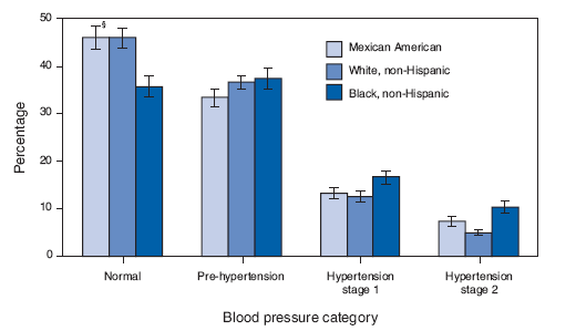 Figure 7 Prevalence of stages of hypertension in Mexican Americans, Whites, and Non-Hispanic African Americans. From: https://www.cdc.gov/mmwr/preview/mmwrhtml/figures/m624qsf.gif.