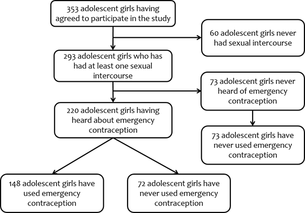 Methods: We conducted a cross-sectional survey of 353 adolescent girls aged 15-24 who were recruited and who completed a pre-established questionnaire after they were accepted into the survey. Data collected were analyzed with STATA 16 software and the comparison of variables with the Chi-square test and a significance threshold of 5%.
