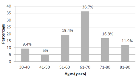 The total number of patients with type 2 diabetes in the hospital registry amounted to 7,830. During the study period, a total of 167 (2.13%) patients developed hypoglycemia. After applying the inclusion and exclusion criteria, a total of 160 (2.04% of all diabetics) patients were included in the study. Gender wise, 60.6% (n=97) were female and 39.4% (n=63) were male. Patients were grouped by decades, and patients aged 61-70 years (36.25%) were the most frequent (Figure 1). According to the family APGAR questionnaire, mild family dysfunction was present in 52.5% of families. Regarding family life cycle, 33.8% of patients were going through the contraction phase (Table 1). After applying the Chi-squared test of independence, a statistically significant relationship between hypoglycemia and family functionality was determined (Chi-square 14.809, p=0.022, Table 2). An association between hypoglycemia and family life cycle phase was also observed (Chi-square 18.028, p=0.021, Table 3).