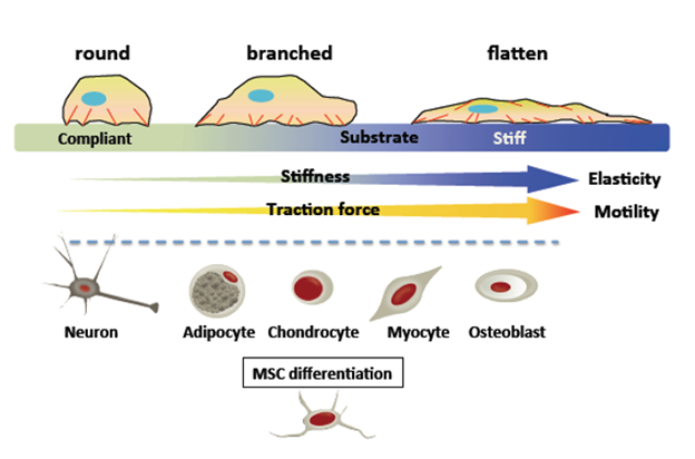 Figure 1 Cells exert a traction force on the underlying substrate and essentially "feeling" this stiffness.2 In general, cells generate greater traction, establish more stable and well-defined focal adhesions, form more defined actin stress fibers (red), and spread more extensively on stiff substrates than on compliant substrates. A soft substrate is beneficial for neurogenic or adipogenic differentiation, a hard substrate is beneficial for osteogenic differentiation, and an intermediate hardness is indicated because "tissue cells feel and respond to the hardness of their substrate". The substrate favors myogenic lineage engagement.3