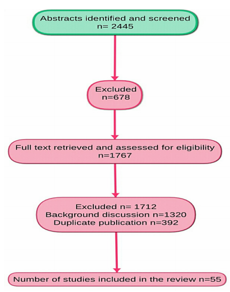 Articles were selected based on specificity. Articles were required to discuss at least one of the following: central obesity and ED, obesity and ED, BMI and ED, waist circumference and ED. Articles that did not compare these factors were deemed irrelevant and excluded in the final review. In total 55 studies were included in this review. Figure 1 below represents a schematic view of data extraction and the management of that data.