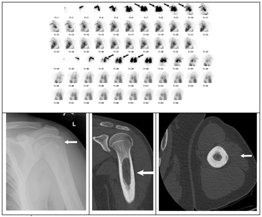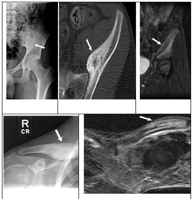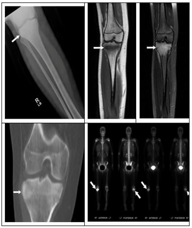 Additionally, it can better identify spinal and pelvic lesions that are difficult to assess via X-Rays.22 Lesions will show initial hyperemia with focal areas of increased uptake on delayed phase images.22 Bone scintigraphy tends to be more readily available and less expensive than whole-body MRIs.20 However, whole body MRI has been shown to have improved sensitivity.23 Therefore, MRI is now being utilized at an increasing rate to evaluate for silent lesions. On MRI, the lesions may be visible along with marrow edema and surrounding soft-tissue inflammations. Whole body MRI use short-tau inversion recovery (STIR) and T1-weighted pulse sequences for evaluation,23,24 Abnormal lesions have increased signal on the STIR sequence and decreased signal on the T1 weighted sequence.23,24 Patients are often having follow up imaging to assess for the status of known lesions and to assess for any new lesions.25 Whole body MRI is recommended, but bone scintigraphy often is done due to increased availability.