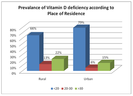 Place of residence: 32 cases lived in rural areas out of which 21 (66%) were Vitamin D deficient. 68 Cases were from urban area out of which 54 (79%) were Vitamin D Deficient (p value 0.994), Figure 2.