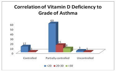 Grades of asthma: Patients were classified into Controlled, Partially controlled and uncontrolled asthma. Grade of asthma severity was compared with vitamin D levels. In the controlled asthma group, 12 out of 13 patients were vitamin D deficient. In the partially controlled group 60 out of 83 patients were vitamin D deficient. In the uncontrolled group there were only 3 out of 4 patients were deficient, Figure 3.
