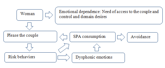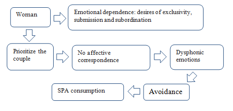 Emotional dependence is defined as the need for bonding extreme that a person feels toward his partner.12,13 This need would configure a dysfunctional personality trait.14,15 Like all traits, it implies a persistent pattern of thinking, feeling and acting with respect to the couple's relationship that are maladaptive and that generates discomfort to the subject who suffers.16 This pattern would include, among other issues, beliefs about the vision of oneself and the other, as well as interpersonal behaviors aimed at maintaining relational closeness in a way that is even harmful to oneself.12 Thus, in the context of the following study, a woman who has emotional dependence devotes a lot of time to the relationship, desperately seeks the welfare of the other, the absence of the couple means for her a situation of discomfort and discomfort, is afraid of abandonment, separation and loneliness, tends to postpone and even deny their desires and need is to satisfy those of the other.12–17 In that sense, it is likely that a woman with emotional dependence start your SPA consumption to please your partner and feel united to him10–18 increase your consumption with the couple;19 consume to cushion and emotional distress because of the crisis, dissatisfactions, threats of rupture and no emotional correspondence.20 In addition, they may not access treatments because they fear losing their relationship with their partner;21 and they remain in relationships even though they are violent, because they depend on him and because he provides them with SPA.22