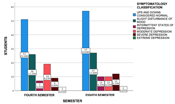 Results: It was determined that 8.23% in the fourth semester presented moderate symptomatology and 5.19% in the eighth semester had severe symptomatology. In the fourth semester 8.23% and 9.09% of the eighth semester have had suicidal thoughts. Also 67.96% of both semesters referred lack of concentration, which affects students' academic performance.