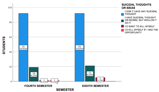 Figure 2 shows that "suicidal thought or desire" was 17.32% (40), 8.23% (19) of fourth semester students and 9.09% (21) of eighth semester students, among the students with this idea, have had the desire to commit suicide but would not carry out the action. 2.59% (6) of the students answered "I would want to kill myself"; although the item "I would kill myself if I had the opportunity" was only 0.43% (1).