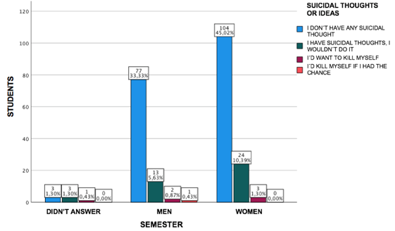 Of the female respondents 45.02% (104) have not had any suicidal thoughts, 10.39% (24) of them have had the thought but would not do it, however 1.30% (3) of women would like to kill themselves but none answered that "They would kill themselves if they had the chance". As for the male respondents 33.33% (77) of them have not had any suicidal thoughts, 5.63% (13) have had the thought of killing themselves but would not do it, 0.87% (2) answered that they would want to kill themselves. The results obtained in the study regarding suicidal ideation were 20.35% (47), of which 11.69% (27) were women, 6.93% (16) were men and 1.73% (4) did not indicate their sex Figure 3.