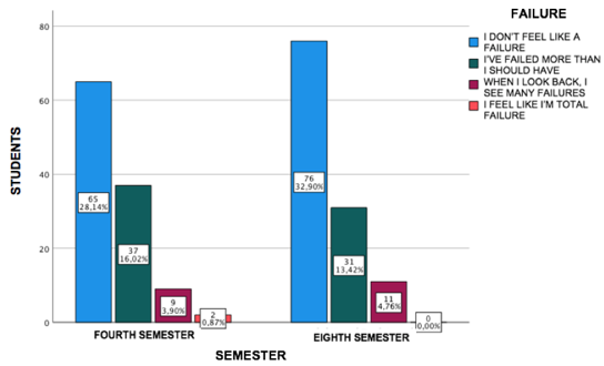 In Figure 4, we observe that the prevalence of "Feeling of failure" was found in 18.18% (42) of the eighth semester students and 20.79% (48) of the fourth semester students. In Figure 5 it is observed in 21.21% (49) of the fourth and 20.78% (48) of the eighth semester that "They do not concentrate as well as usual"; 12.12% (28) students of the fourth semester and 10.39% (24) of the eighth semester "It is difficult for them to keep their mind on something for a long time; and both semesters, 3.46% (8) answered "They do not concentrate on anything".