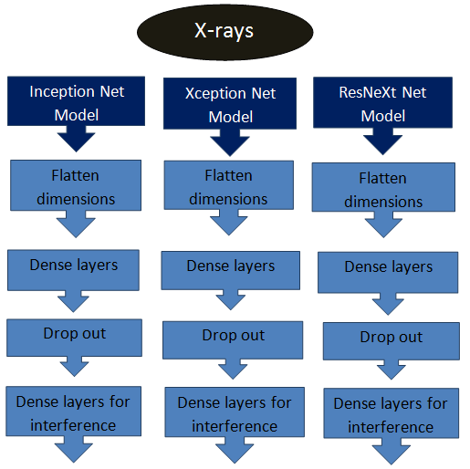 In 2012, first known cases of the Middle East Respiratory Syndrome (MERS) associated with COVID-19 occurred in Jordan. Its first case reported in Jeddah, a district of Saudi Arabia. Molecular Detection of MERS-corona RNA was done in real time PCR. The first open reading frame ORF1a and 1b were used as a diagnostic target for species identification-MERS_CoV can encoded almost 10 open reading frame with 5´and 3´ untranslated regions, various structural proteins including spike like ( E) , Membrane (M) and nucleocapsid proteins. Their products were used to encode the non-structural proteins.11 The presence of various viral proteins detects the presence of infectious virus. Different approaches are used. ELISA a monoclonal antibody based targeting the nucleocapsid protein of MERS-CoV give the sensitivity of 103TCID50 with 100% specificity. Corona virus first recognized as a throat infection. IN this work the healthy people and the people infected with Covid-19 analyzed with the help of CT images and the chest X-ray images.12 The scientists collected the X-rays images from the different sources and applied on the three different models such as Inception V3, Xception and ResNeXt. The analysis were done by the CNN machine. The machine will give the X-ray images of the infected patients. The COVID-19 was diagnosed by the X-ray images based on the CAPS network. This work is based on the Dataset which consists of the 3 x-ray chest scans for the affected, normal and pneumonic. Total 6432 x-rays images were collected. Among these, 1345 were normal, 490 were COVID and 3632 were pneumonic.13 Three different X-rays analysis were proposed.