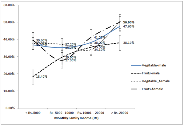 In both young men and women, those in higher income brackets seem to consume vegetable and fruits more frequently than those in lower income brackets (Figure 1). Frequency of fruit consumption is considerably low in young men, and economic hardships seem to aggravate this poor dietary behavior in them.