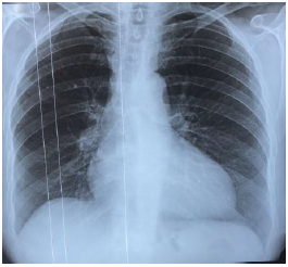 68 year-old female, born in USA, 143 pounds of weight and a 5 ft. 7 in. height; medical history of arterial hypertension, 2 years of diagnosis in pharmacological treatment with telmisartan 80mg/hydrochlorothiazide 12.5mg orally every 24hr and depression, not following the treatment. The patient arrived emergency room presenting shortness of breath with progressive minimal efforts dyspnea, orthopnea and supine hypotension. Chest x-ray: 40 % bilateral pleural effusion, mediastinal adenopathies and veiled hemidiaphragm (Figure 1). Chest tomography: cardiomegaly with global cavities increase, paratracheal adenopathies, bilateral passive atelectasis and bilateral pleural effusion (Figure 2,3).
