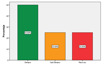 Regarding the nursing staff, 100% of them consider that their knowledge of the home visit is good (25% male and 75% female) . However, 50% mentions that they want to receive training to improve the sites. While 25% of the Female sex or says that it is better to take an intensive course. The results show that 75% of the nursing staff has not received training, 75% of the female nurses perform their home visiting role while 25% of the male sex does so. To the nursing staff to survey him on whether he gives time to perform all their activities to do home visit 50% responded that rarely gives time and 25% said he never gives time. 25% of nurses said they rarely spend hours working for conducting home visits and 75% said they almost always. 25% say the patients almost they always and rarely accept a home visit, respectively See Figure 4. Reference to accompanying you have to make home visits, 50% said they rarely accompany while 25% said they almost always. 50% of the nursing staff responded that when they made the home visit, they rarely found the correct address; while 25% answered that they always found it See Figure 5. To the patients that have been made the home visit 75% rarely it has been found at your home. 75% of nurses say that during the home visit there is never any security, while 25% say it rarely exists. 50% of nurses mention that the distance between the Health Center to the colonies is less than 1 kilometer away, while 25% say they are at a distance of 3 kilometers and 25% mention that they are more than 5 kilometers See Figure 6. 75% of the nurses say that 50% of the streets are paved, while 25% say that 25% are paved.
