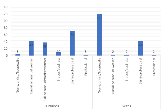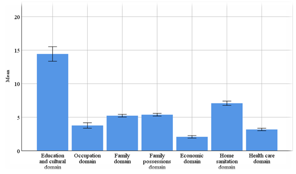 The occupation of the husbands, and their wives is shown in (Table 3 and Figure 2). Among the husbands 72(42.4%) were semi-professional/clerk, 38 (22.4%) were skilled manual worker/farmer, 42 (24.7%) were unskilled manual worker, 10 (5.9%) were working in trades/business, 5(2.9%) were not working, and 3 (1.8%) were professionals. Among the wives, 121 (71.2%) were non-working/housewife, 43 (25.3%) were semi-professional/clerk, 2 (1.2%) were unskilled manual worker, 2 (1.2%) were working in trades/business, and 2 (1.2%) were professionals. The scores of domains of socio-economic status (SES) of the study subjects expressed as mean, median with interquartile range (IQR), and the range were nearly all in the middle of the range, with a mean ± SD, 14.44 ±7.165 for education and culture domain, 3.77±2.663 for occupation domain, 5.23 ± 1.324 for family domain, 5.38 ±1.323 for family passion domain, 2.08±1.226 for economic domain, 7.09 ± 2.115 for home sanitation domain, and 3.18 ±1.188 for health care domain, respectively. The mean ± SD of total score of SES was 41.15 ± 11.25, the minimum score was 15, and the maximum score was 63 (Table 4, Figure 3). The median (IQR) of total score of SES was 42.00 (32.00, 50.00) (Figure 4).