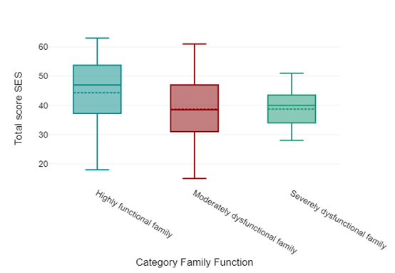 The association of socioeconomic status and multiple familial outcomes was established for long time. The quality of parent-child relationships, as well as a variety of developmental outcomes for adults and children, are all correlated with social class, or socioeconomic status (SES), according to research findings. These relationships also hold true for the satisfaction and stability of romantic relationships. Incorporating assumptions from both the social causality and social selection perspectives, these findings provided evidence in favor of an interactionist model of the association between SES and family life.40 In 2012, Ferdi Botha, Frikkie Booysen, and Edwin Wouters conducted a nationally representative sample survey of persons over the age of 16 that included 2547 respondents to study family functioning and socioeconomic position. The Family Attachment and Changeability Index was used to assess family functioning, and multiple correspondence analysis was utilized to create indices of individual, household, and subjective SES. The results multivariate regression analysis suggested that household- and subjective SES are associated with the perceived flexibility in the family, and no association was found between SES and family members’ attachment to each other, findings that supported the social causation hypothesis.41 A community sample of 125 families from various ethnic backgrounds, including Black or African American, Latino, Asian, and White, was used to study how income status affected family functioning, social support, and quality of life. The study used the self-report measure "the Family Assessment Device" to gauge how well families were perceived to be functioning (FAD). The findings showed that having a family member with a mental disease affected family functioning differently depending on financial status, and that low-income status was linked to decreased satisfaction with numerous aspects of family functioning. Additionally, low-income families scored much worse on social support and quality of life than higher-income households.42 The considerably higher SES score in the highly functioning families' as compared to the moderately dysfunctional families in the present study provide additional evidence for the outcomes of the previous research.