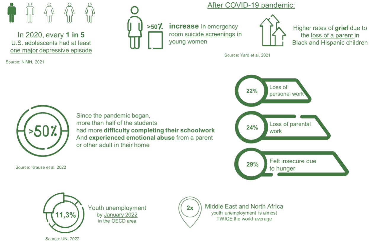 The uncertainty characteristic of adolescence and early adulthood is currently heightened by pandemic-induced social isolation, social media, economic headwinds, and eco-anxiety, creating a real mental health crisis in young people and making global youth disillusionment a real threat. Eco-anxiety affects the daily lives and functioning of nearly half of the children and young people worldwide, who often blame government inaction for not doing enough to protect them.3 Regarding the pandemic, although youth have been relatively protected from the lethality of the COVID-19 virus itself, they have been more vulnerable to its social, economic and psychological impacts.4 Moreover, unlike physical health conditions, three-quarters of mental health disorders manifest themselves before age 25.5