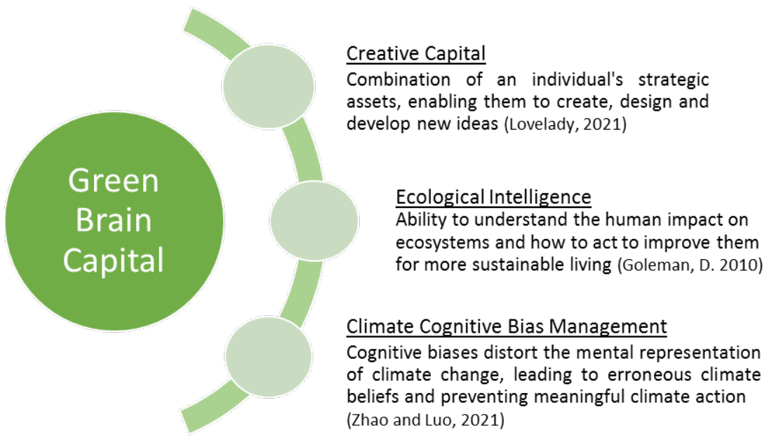 The uncertainty that marks adolescence and early adulthood is heightened by the simultaneous crises of mental health, education and youth unemployment. This puts the brain capital of young people under threat. We must invest in youth brain health and skills that are orientated towards environmental sustainability. This can train future creatives to develop impactful solutions to the current climate crisis as well as develop citizens who are ecologically intelligent and willing to enact environmentally sustainable and resilient behaviors. In effect, we propose a youth green brain capital model. This approach aims to refine and advance this agenda, including specific policy innovations, new investment approaches, and the development of a dashboard of instruments to track green brain capital. Our vision is to empower the next generation with ecologically intelligent leadership skills to address the pressing challenges of the climate crisis.