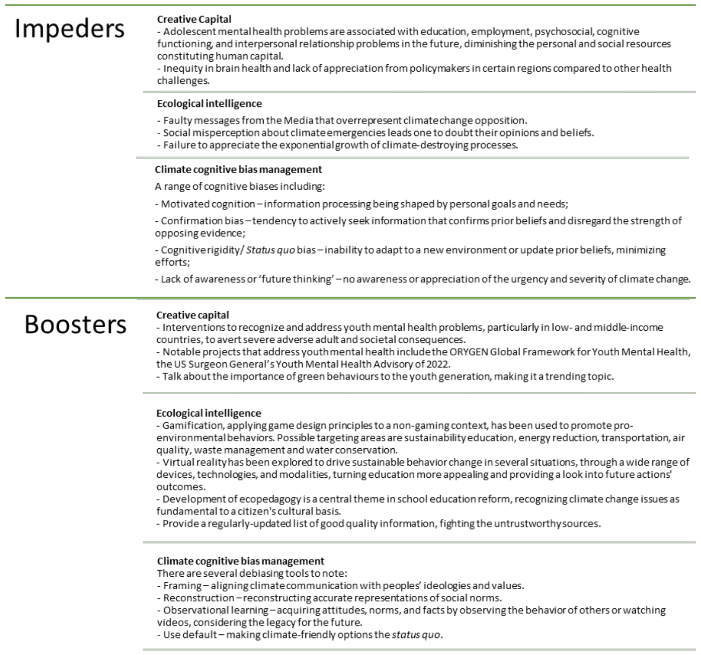 Society must undergo a major transformation of habits and behaviors at many levels, shifting perspectives, priorities and practices to answer the sustainable development's current and future challenges. For that to be possible, we require the development of more aware, informed, and educated communities and individuals; brain capital. In Table 1, we delineate boosters and impeders of green brain capital, which can be relevant at multiple scales, from the individual, family and community to the environment and society.