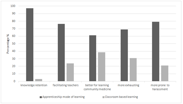 A total of 300 students were included in the study. When assessed with respect to better cognitive outcome, students preferred the apprenticeship mode of learning in terms of generating greater interest (97.0%), and promoting active (95.0%) and collaborative (90.0%) learning. It also led to better comprehension (86.7%) and knowledge retention (97%). They students believed that the apprenticeship mode maintains their level of interest (97.0%) and helps them stay more focused (78.0%). They also found it better for polishing their interpersonal skills when it comes to interacting with the teachers (96.7%), patients (96.7%), and their colleagues (90.7%). The students inclined towards apprenticeship mode as the teachers are more facilitating (76.3%), helping them achieve better scores (68.3%), and involving performance-based assessment (90.3%). Apprenticeship was the clearly favoured mode when it came to better career-building (94.7%) due to an effective combination of providing greater professional development (96.7%) and boosting the confidence levels when practicing medicine (97.7%). The students regarded apprenticeship to be the faster (94.7%), more productive (96.3%) and catering to students’ needs. Apprenticeship was found to have its own limitations, on account of being physically exhausting (69.0%), prone to favouritism (59.3%), and rendering students more vulnerable to harassment (79.0%). With respect to the subject of Community Medicine, 61.3% students believed that topics such as malnutrition, immunization and control of infectious diseases could be learnt better by apprenticeship in a practical setting. Even with the availability of multimedia assisted lectures, about 70% students preferred the apprenticeship mode for learning a practical subject like community medicine. When asked which system they would want to be implemented if a change is made in the current system, 69.9% opted for apprenticeship mode of learning. However, only 39.3% thought that it would be easy to adopt in our current setup. Tables 1–3 show the statistically significant results of our study (Figure 1).