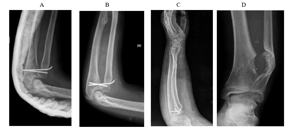 After 16 days, a new bone mass was identified, which was installed in the ulna region and associated with dislocation of the radial head referring to the left upper limb. This joint was reduced the following day (08/01/2017) and stabilized by proximal radio-ulnar fixation with two Kirschnner 2.0 wires, which prevented pronation and supination. hospital discharge on the date following this surgical procedure in good general condition and with preserved mobility of the fingers ipsilateral to the procedure. These bone masses were suspected for osteochondroma. The extracted tissue was sent to anatomopathological study after the two surgeries performed. The diagnosis of osteochondroma was confirmed and periodic control radiographs were performed postoperatively (Figure 1). In reassessment on 08/09/2017 and 08/30/2017, the patient was in good general condition and with satisfactory evolution of both surgical sites both from the clinical and radiographic point of view. Thus, we opted for follow-up after surgical resection of the osteochondroma.