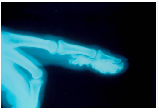 The family doctor must know these lesions and have an action procedure like the algorithm proposed by Verhoeven.9 It is very important that the injured is immediately transferred to an emergency unit, where the doctor will take into account the characteristics of the product used and the industrial injection system, assess the state of the hand and general condition of the patient and decide the attitude to follow with the support of the orthopedic surgery specialist. The injury-treatment interval, in which an adequate coordination between the paramedical and medical team (since the accident warning is given, the transfer to the hospital center is properly carried out and a specific specialized protocol is applied) significantly reduces the degree of final sequelae, emergency surgical debridement being known to reduce the risk of amputation.10 Although the use of corticosteroids is under discussion11 the authors recommend the use of i.v. of 250 mgr. of prednisolone diluted in 100 ml of saline solution in a single preoperative dose, there being no evidence that its use in the acute phase increases the risk of infection or the incidence of amputation,10 avoiding an acute inflammatory response to the fluid injected. Unfortunately, even after a early and adequate treatment, the complications and sequelae are frequent and important: tissue necrosis (Figure 3), infection, fibrosis that evolve towards rigidities, digital atrophy and complex regional pain syndrome, the most feared one being the compartment syndrome. The digital amputation rate after these injuries is 48%,12 reaching 100% when the substance is injected at a pressure higher than 500 kgr/cm2, according to the review carried out by Schnall.13 Remember that amputation is not only carried out by the appearance of complications such as necrosis or infection, but also by the presence of a stiff finger, which sometimes, especially in manual workers,14 can become annoying and even cause subsequent accidents when handling industrial machinery. However, the main complication is the initial underestimation of the lesion, which leads to a delay in treatment and a greater number of sequelae,15 so an adequate initial medical action is crucial. Prevention is the Gold Standard in the management of these injuries, based on three actions: the continuous training of workers who handle these systems of injection of substances, the investigation of substances which are more water soluble and less harmful to the organism, and the improvement in Individual protection equipment and development of industrial safety devices (automatic stop in emergency situations, automatic unblocking, ...) in compliance with labor legislation.16 The accurate treatment of these lesions has its limitations in terms of the final result of the functionality of the hand, so it is necessary that medical science and industry continue to work together to reduce the aggression and sequelae of this type of accidents.