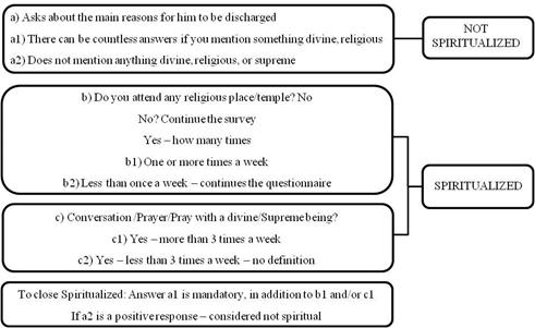 We evaluated 200 patients admitted to the Intensive Care Unit (ICU) due to clinical pathologies that were lucid and conscious. Because there is no single and established methodology, it was decided to elaborate a score of easy applicability in the patients evaluated by this group to classify the patient as spiritualized or non-spiritualized. Before classifying them as spiritual or not, the risk of mortality in this hospitalization was calculated through the Simplified Acute Physiology Score III (SAPS 3). The 200 patients had a predictive score of death around 20% (18.5% to 21%).