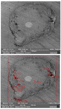 The cuts are made using diamond discs at the level of the apical third of the endoprosthesis in order to perform the respective observations under a microscope and determine the presence, size of air bubbles in the cementing agent in the three groups. Obtained the cuts of the pieces of the three groups was performed the process of preparation prior to the observations in scanning electron microscope (SEM) in high vacuum TESCAN MIRA3 FEG with resolution of 1.2nm. The cleaning process of the samples was carried out under a stereomicroscope with 99% anhydrous ethanol. To avoid impurities the samples were dried with compressed air. The samples were coated by a conductive material to allow observation under a microscope. In these samples, a Quorum Q105R sputter coating gold evaporator was used under the following conditions: 15 mZ and 80 mTorr for 1 minute to produce a thickness of approximately 20 nm. The samples were introduced directly into the carousel of the scanning electron microscope TESCAN MIRA 3 (.The samples were observed with a voltage of 5 Kv and several microphotographs of its topography were obtained Figure 1 & Figure 2. Once the previous preparations were made, the observation was carried out in a scanning electron microscope Figure 3, dividing the sample into three groups, obtaining the following microphotographs in which measurements were made subsequently expressed in tables.