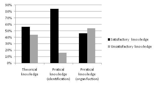 Figure 2 Male pelvis anatomy theorical and practical knowledge (anatomical structure identification and function). Satisfactory anatomical knowledge (black columns) represents a hit rate ≥ 60%; Unsatisfactory anatomical knowledge (grey columns) represents a hit rate <60% (n=50).