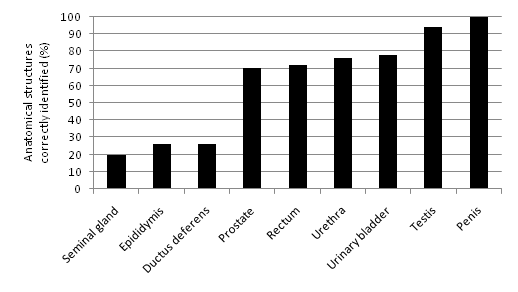 Figure 3 Percentage (%) of correct identification of anatomical organs of the male pelvis (n=50). The evaluation was performed using a synthetic anatomical model of the male pelvis.