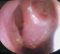 In about 95% of the cases, the nasal mucosa is affected.14 Therefore, it is important to perform an otorhinolaryngological examination for an early diagnosis of leprosy. The involvement has a descending character, starting in the nasal cavities and progressing to the mouth and larynx.12 Initially, crusts formed, nasal congestion and serosanguineous influence by affecting the antero -inferior portion of the nasal septum. As the disease progresses, grayish or pink nodules appear, which are slightly elevated and tend to ulcerate, as a consequence, obstruction of the nasal septum may occur, especially in the cartilaginous portion.15 This continuous process of septum necrosis causes a nose to sink and collapse with an appearance “nose in binoculars”.16