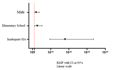 The association of lifestyle and health literacy presented a PMR of 18.68 with 95% CI (10.03-34.82) with a p <0.05 (Table 4). Within the multivariate analysis, health literacy presented a PROM of 17.86 with 95% CI (9.50-33.58); males had a WMR of 1.99 with a 95% CI (1.07-3.71) and basic education had a WMR of 2.61 with a 95% CI (1.28-5.30) (Table 5, Figure 1).