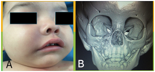 Figure 1 (A) Right hemicra volume increase, (B) Volumetric reconstruction: anterior wall and alveolar apofifis of the right maxilla with bone erosion as well as orbital floor.