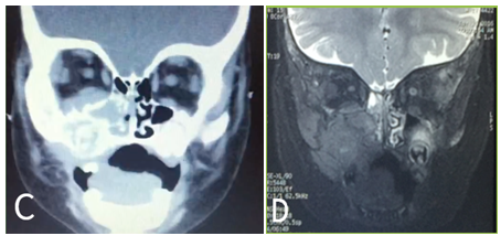 Contrast MRI: increased volume of soft structures in the right half of the face, involves soft and muscular tissues surrounding the alveolar process of the right maxilla, displaces upward orbital floor structures and moderate soft tissue reinforcement. (Figure 1B) Simple CT: soft tissue volume increase in the medial wall of the right maxillary sinus that partially obstructs the nasal cavity, remodeling and bone infiltration of the anterior wall of the maxillary sinus and occupied by density to liquid (Figure 2A) (Figure 2B).