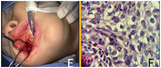 Pediatric patient of 1 year 5 months of age, Hospitalized in the oncology pediatric service for clinical picture of 5 months of evolution characterized by volume increase in right maxillofacial region, hyaline rhinorrhea in sometimes greenish of right nostril, ipsilateral epiphora and febrile pictures . Pathological antecedent: a previous year was diagnosed with acute T-cell lymphoblastic leukemia (ALL) and received multiple chemotherapy schemes, the last report of bone marrow aspirate with morphological and molecular remission of ALL. During the treatment he presented infectious fungal diseases. They request interconsultation to otorhinolaryngology with diagnosis of right maxillary sinusitis, probably fungal. Physical examination showed an increase in volume in the right maxillofacial region with a hard, non-painful consistency, no changes in coloration, mild proptosis of the right eyeball. (Figure 1A) Anterior rhinoscopy: abundant hyaline rhinorrhea of right nostril and erythematous mucosa, no occupational tumor is observed.