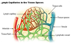 In physiological conditions the capillaries filter at the level of the arterial end (arterioles) and reabsorb into the venous (venula). 90% of the arterial filtrate is reabsorbed at the venous level and 10% (about 2 liters per day) of the interstitial fluid (with water, proteins, dead cells, viruses) is recovered by the lymphatic system, which prevents the formation of edemas by pouring it into the blood circulation. In pathological conditions, if the lymphatic system is damaged, for example due to radiotherapy or surgery with removal of the lymph nodes, the interstitial fluid cannot be completely reabsorbed by the capillaries, so it accumulates in the interstitial tissues and creates swelling. Lymphedema is therefore an edema due to an alteration of the lymphatic system. The lymphatic system consists of lymphatic capillaries. Lymphatic vessels originate between the cells of the interstitial connective tissues with very permeable capillaries covered. The lymphatic capillaries and the extracellular matrix, from which they originate, are endowed with negative pressure; this facilitates drainage of excess interstitial fluids (lymph), preventing edema and lymph nodes. The endothelium may be continuous or fenestrated, fusiform-like cells, with abluminal surface (interconnected with tissues by basal membrane, collagen, proteoglycans, heparansulphates, integrins) or luminal (interconnected with blood by Fazzy-Coat: mucopalisaccharides, glycoprotein, fibrinogen, fibrin) with elastic cytoskeleton that allows to saturate any continuous solutions. Among the endothelial functions we remember the function of selective barrier between blood and tissues. The formation of edema occurs at the microcirculation, that is in the area where the interchange of molecules takes place between the blood and the interstitial liquid and between this and the cells of all tissues (Figure 2).5,6