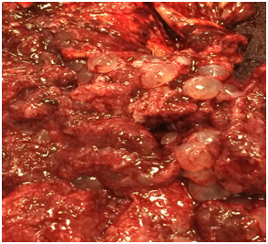 The case is presented of a female patient 15 years old, without prenatal care, primipara with 20 weeks of gestation for pregnancy amenorrhea, with labor in second stage. Go presenting severe headache and presence of tinnitus, phosphenes, type obstetrical pain, bleeding transvaginal moderate dark red. On admission an average blood pressure of 130mmHg is detected. Physical examination, normocefala without cardio alterations - lung, globose abdomen expense of gravid uterus, uterine fundus of 19 cms, fetal heart rate of 140 beats per minute, vaginal examination with presence of little bleeding not active, with dilation and effacement complete, intact membranes, tendon reflexes increased ++/+++, without the presence of edema. We performed ultrasound finding only living product of fetometria 22 weeks, weighing 449 grams, no congenital malformations apparent. Sonographically normal placenta and cord. It atiendio delivery and non-viable, male, weighing 440 grams, of 20 weeks only, immature, live product is obtained, no congenital malformations apparent (Figure 1). Placenta and cord dropsical presence of vesicles (Figure 2).10,11 He requested fraction of human chorionic gonadotropin beta immediately after birth, finding levels 32.816 mU/mL; in the preeclamptic profile, lactic dehydrogenase of 1,033 U/L and proteinuria 500 mg/dL in the urinalysis, other normal preeclamptic profile, Group O and RH negative. It began handling with neuroprotection with magnesium sulfate, hydralazine antihypertensive 30 mg orally every 8 hours. It evolved satisfactorily and was discharged by appointment for consultation aimed to monitor postpartum to detect early forms of trophoblastic disease control persistent and hypertensive disease associated with pregnancy.12–15