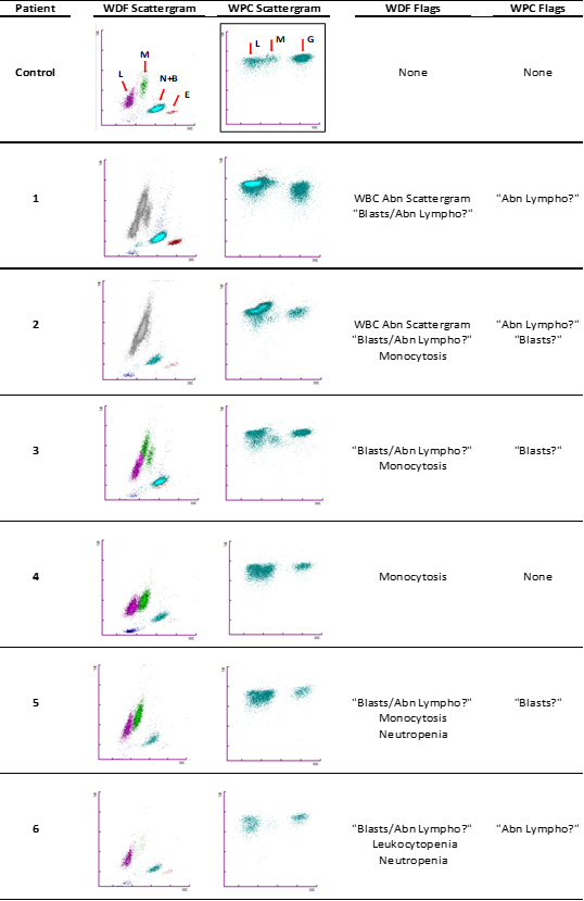 In our series WPC channel classified two samples with “Abn Lympho?”, two samples with “Blasts?” and one sample with both flags. All samples presented abnormal WPC scattergram: the majority presented lack of the monocytes cluster (patients 1,2,4,5 and 6 (Figure 1). The remaining patient showed a monocyte cluster probably related to its normal monocyte count but with an abnormal position lower than control samples (patient 3, Figure 1).
