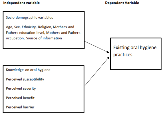 Conceptual framework for the oral hygiene practice its associated factors Figure 1, evaluation of health education package is shown in Figure 2 which is adopted from health belief model. In the above framework the factors like socio demographic factors, knowledge, perceived susceptibility, severity, benefit, and barrier are independent variables of the study which are directly associated with the dependent variable i.e. existing oral hygiene practices. The framework helps to identify whether there is relation between these factors and oral hygiene practices. Framework also illustrate the relation between existing oral hygiene practice and oral health education package. After identification of the status of oral hygiene practice effective health education package is designed and implemented. Oral health education package is effective in increasing knowledge, perceived severity, susceptibility, benefit, barrier which ultimately leads to improving oral hygiene practices among the participants.