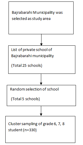 Bajrabarahi Municipality was selected as study area then the list of the private school was obtained from the District Education Office (DEO) of Latitpur. Then the random selection of the private school of Bajrabarahi Municipality was done according to the sample. Finally the cluster sampling of grade 6, 7, 8 was done. According to the sample size 5 school was chosen randomly for the baseline study (Figure 4).