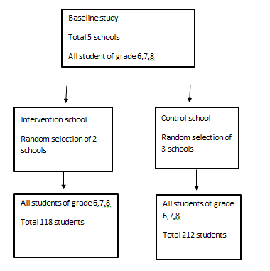 For the intervention study from the total 5 school of the baseline study 2 school is selected randomly as intervention school which consist of 118 students and 3 school was randomly selected as control school which consists of 212 students (Figure 5).