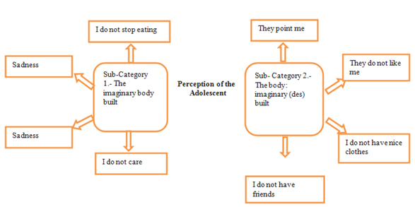 Subcategory 1: The imaginary body built, we realize how important the body is, since it is in the stage where the physical body is the most important, where it is in a society that is the school, that makes you accept yourself in that society and if you do not accept it because of your physique, then this makes you not comfortable with your body and see it as something bad, since as it is found in the physical and psychological changes it is not accepted as is, and to think that they do not accept it because of their physique, causes the adolescent to become depressed and not change his eating habits and exercise to change his image, on the contrary, he comes home to eat. It is important that he accepts himself as he is and that he is helped to raise his self-esteem, so that he becomes aware of how important it is to lose weight, but not because of how I look if it means being over weight, but for this, he would have to first accept that he is obese, really have the knowledge and knowledge of what obesity is and above all the consequences that can occur if he does not take care of himself, and that he does not think that with the passage of time this can improve, and get to have an ideal body without doing anything to achieve it. The second subcategory: The imaginary body (de) built, it was observed that the adolescent is very concerned about what his classmates say about the physical body he has, and especially the opposite gender, since this stage begins to be fixed in their companions, but nevertheless, as society is so influenced by the media, they do not see well adolescentes with obesity ignoring them by their physique, at this stage of development what is important is physical beauty, therefore the adolescent with Obesity, feels assaulted, stigmatized and this causes their self-esteem to go down and that the adolescent feels less than the others affecting the role he plays in school, for this reason it is important that he be made aware to his classmates that it is a health problem.9–11