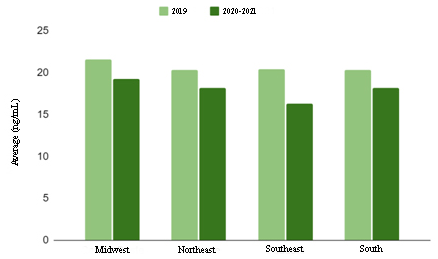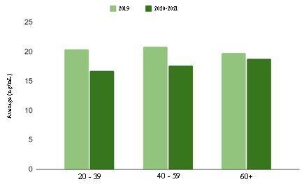 Of the total of 1,421 tests performed in the observed period, 25.2% were performed in 2019 (pre-pandemic) and 74.8% were performed in 2020 or 2021 (pandemic). Most of the individuals tested were women over 20 years of age. The proportion of individuals over 60 years was higher in 2020-2021, compared to 2019 (12% vs. 39.5%) three times bigger during the pandemia. The mean D vitamin levels were significantly lower in the pandemic period compared to the pre-pandemic period (2019: 20.44 ng/mL; 2020-2021: 17.8 ng/mL; F1=32.18, p<0.0001). There was no significant difference in D vitamin mean between cohorts by gender, age or region.