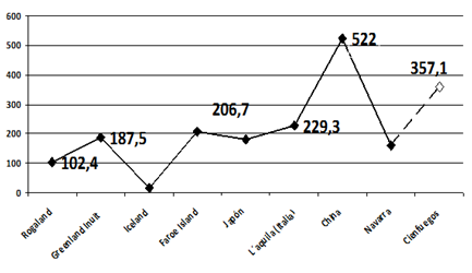As a result of the present work verify that for a total population (42028) of people in the area number two of Cienfuegos City (Table 1), a significant part is represented by individuals older than 60 years (8681) what represents approximately 20.7% of the total. Representing the majority of the patients the older than 65 years of age group with a total of 5957 individuals. Both in the group from 60 to 64 year and in that of 65 years and more, the female sex prevailed, with a number of 1426 and 3267 respectively. Confirming that population is one with trend aging (Figure 1). Serving the variables related to the age (≥60) in the patients with PD Parkinson's disease belonging to this area of Cienfuegos City (Table 2) reveal that the disorder occurred with greater predominance in the group of patients older than 65 years (n=27) representing 87.1% of the total, remaining a light supremacy in the male sex (15/12), that it in addition is non-exempt in the group of patients with ages from 60 to 64 years (3/1). The total of patients with the disease in this extension, resulted to be of 31, obviating 2 cases died, a woman and man, both older than 60 years old. In the Figure 2 see as is distributed the prevalence of the PD in men and women according to different age groups, where see as this increases in the 2 extreme groups and still greater it is in the group of older than 81 years, corresponding the greater value than the male sex. In the Table 3 see as the prevalence of the grou PD of the health area was of 357.1 per 100 000 population, finding its value maximum in the agep above the 65 years and of this the male sex is kept with the greatest number of patients (15/557.6); being the total prevalence of the area of 73.8 per 100000 population. The Figure 3 show as behaves the prevalence of this population in comparison with the found in different countries, being higher than the mean of these (±166), surpassed only by the study conducted in Chinese woman who presented a prevalence of 522, fluctuating even up to as low values as 16 in Iceland.
