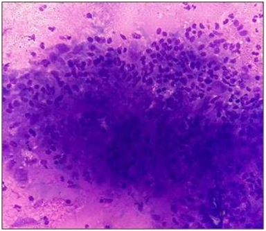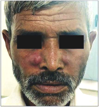 A 50-year-old male presented with a 4-month history of facial swellings in the bilateral maxillary sinus region. The patient was a labourer and belonged to a lower socioeconomic status. He also gave a history of persistent dull ache in the facial bones and orbit along with progressive weight and appetite loss since last one month. However, there was no history of fever, trauma, respiratory, or genitourinary symptoms. His medical history for any major disease or prior surgeries as well as family history was non-contributory. On general physical examination, he was of average built and was anemic. Local examination of the bilateral facial swellings revealed them to be ill-defined, tender, soft and and the overlying skin was slightly erythematous (Figure 1). All other systemic examinations were within the normal limits. His routine hematological investigations revealed microcytic hypochromic blood picture with normal erythrocyte sedimentation rate (ESR). The biochemical and microbiological tests as well as X‑ray chest showed no abnormality. Endoscopic examination showed no nasal mass or polyp. A provisional clinical diagnosis of chronic sinusitis was made and the patient was put on conservative management. However, the patient did not respond to the course of antibiotics as the swellings progressively grew in size. He was revisited again and fine needle aspiration cytology (FNAC) of bilateral maxillary sinus region swellings was performed to arrive at a diagnosis this time. FNAC done from these swellings yielded blood mixed mucoid aspirate and the smears examined showed numerous epithelioid cell granulomas along with intact and degenerated inflammatory cells. Occasional multinucleated langhans type of giant cells and focal necrosis was also seen (Figure 2). Special stain for tubercle bacilli (Ziehl-Neelsen stain) showed few acid fast bacilli (AFB) thus, establishing the diagnosis of bilateral maxillary sinus TB (Figure 3). On further investigations, mantoux test came out to be positive. His sputum and urine were also tested for AFB. However, they were negative for it. The patient was started on a 6-month course of antituberculous treatment (ATT) with rifampicin, isoniazid, pyrazinamide, and ethambutol. He was under regular monthly follow-up, and there was no clinical or laboratory evidence of recurrence or any fresh complaints even after 1 year of treatment.
