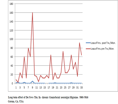 Figure 2 Loss of Work Hours per month prior and post-treatment/years lining without migraine headaches: Significant changes witnessed in the post-treatment reduction of hour’s loss at any headaches-migraines occurrences at the workplace.